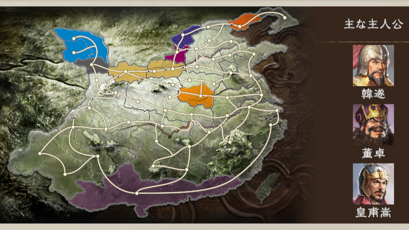 「黄巾の乱」収束後、各地で後漢朝廷への反乱が続いている。 反乱軍の中で勢力を拡大しているのは韓遂。鎮圧に手こずる何進の後漢朝廷は董卓を派遣。 従って董卓は何進と友好、韓遂とは敵対。 数年後に朝廷を牛耳る董卓の台頭はここから始まる。